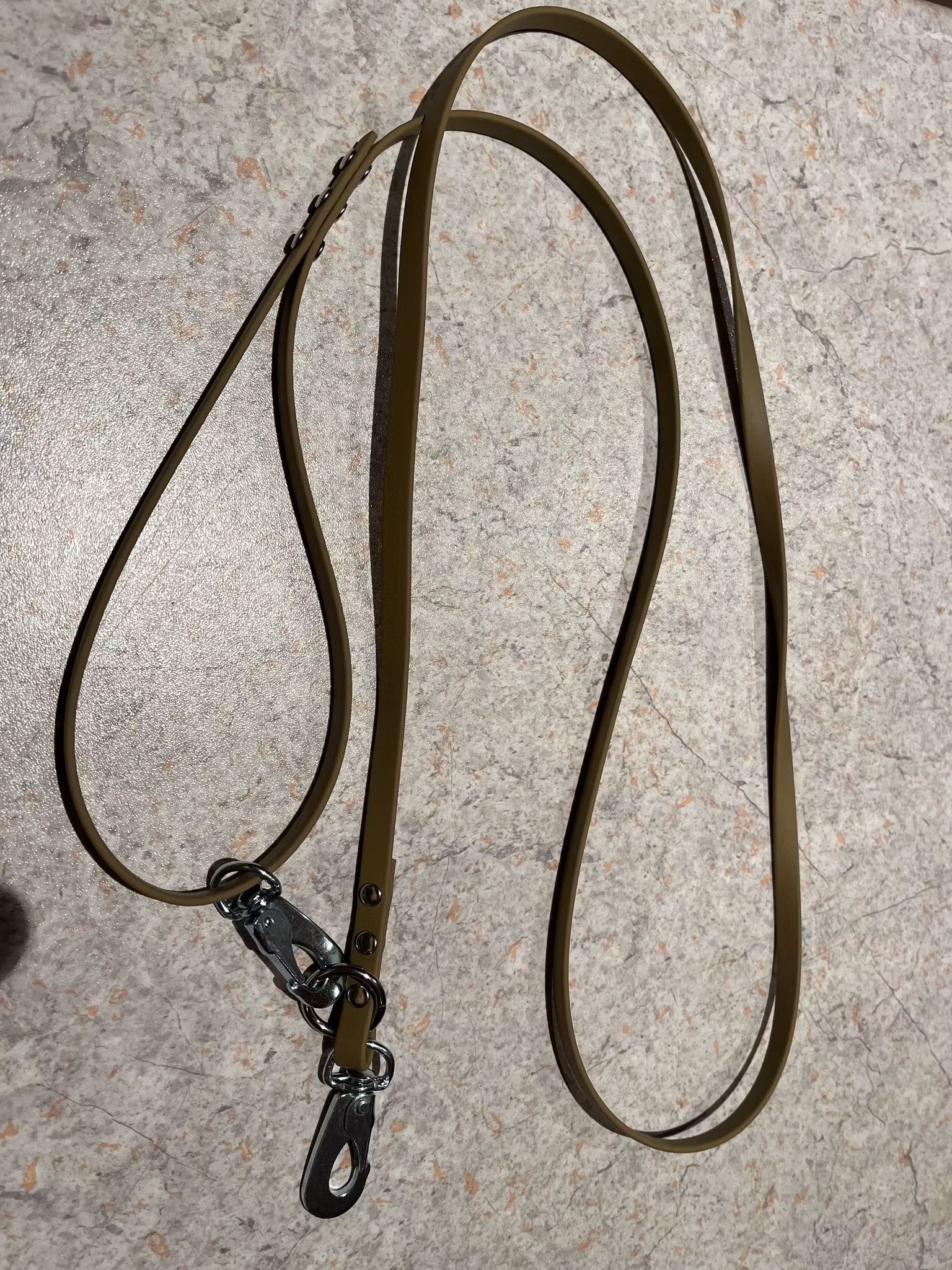 Trening/bykobbel av Biothane er laget sånn at det kan foldes i 2. Dette gjøres ved å feste kroken i håndløkkem til ringen ved den andre kroken.